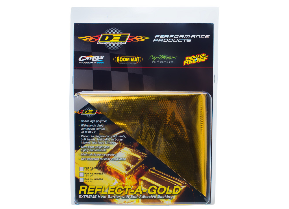 Samolepicí tepelně izolační zlatý plát DEi Design Engineering Reflect-A-GOLD je zlatě metalizovaná tkanina na bázi skelných vláken vhodná pro použití v extrémních podmínkách. Je extrémně lehká a snadná pro aplikaci. Hodí se ideálně na zakrytí požárních příček, boxů vzduchového filtru, krytů motoru a dalších částí. Balení obsahuje zlatý plát o rozměru 30,5 x 61 cm, který je možné jednoduše upravit na požadovaný rozměr pomocí nože nebo nůžek