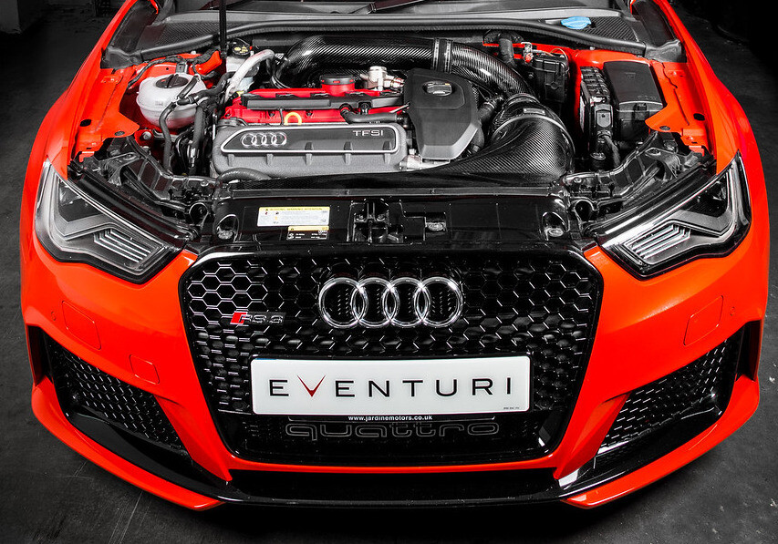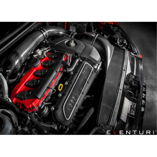 Karbonový kit sání Eventuri pro vozy Audi RS3 nastavil zcela nový standard pro sportovní sání pro tuto platformu. Sání bylo navrženo tak, aby plnilo dva základní úkoly - 1) Zajistit co nejpřímější vedení vzduchu do turbodmychadla. 2) Udržet co nejnižší teplotu nasávaného vzduchu. První požadavek byl splněn použitím zvětšeného vedení o průměru 88 mm po celé délce až k turbodmychadlu ve spolupráci s patentovaným tvarem airboxu.