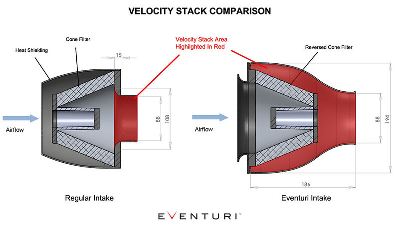 Kompletní airbox karbonového sání Eventuri se skládá z vnějšího obalu vyrobeného ze 100% prepreg karbonu, špičkové kónické vložky vzduchového filtru, hliníkového hrdla a laserem řezaného kovového držáku. Oproti běžným sportovním filtrům je přechod mezi průměrem nasávání a vstupem do sací trubice tvořen celým vnějším obalem a je tak pozvolný, což zamezuje nežádoucímu tlaku, který u běžných sání vzniká v přechodu mezi filtrm a sací trubicí. Na obrázku níže můžete princip airboxu Eventuri porovnat s běžným sportovním sáním: