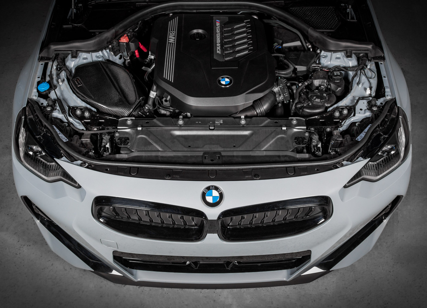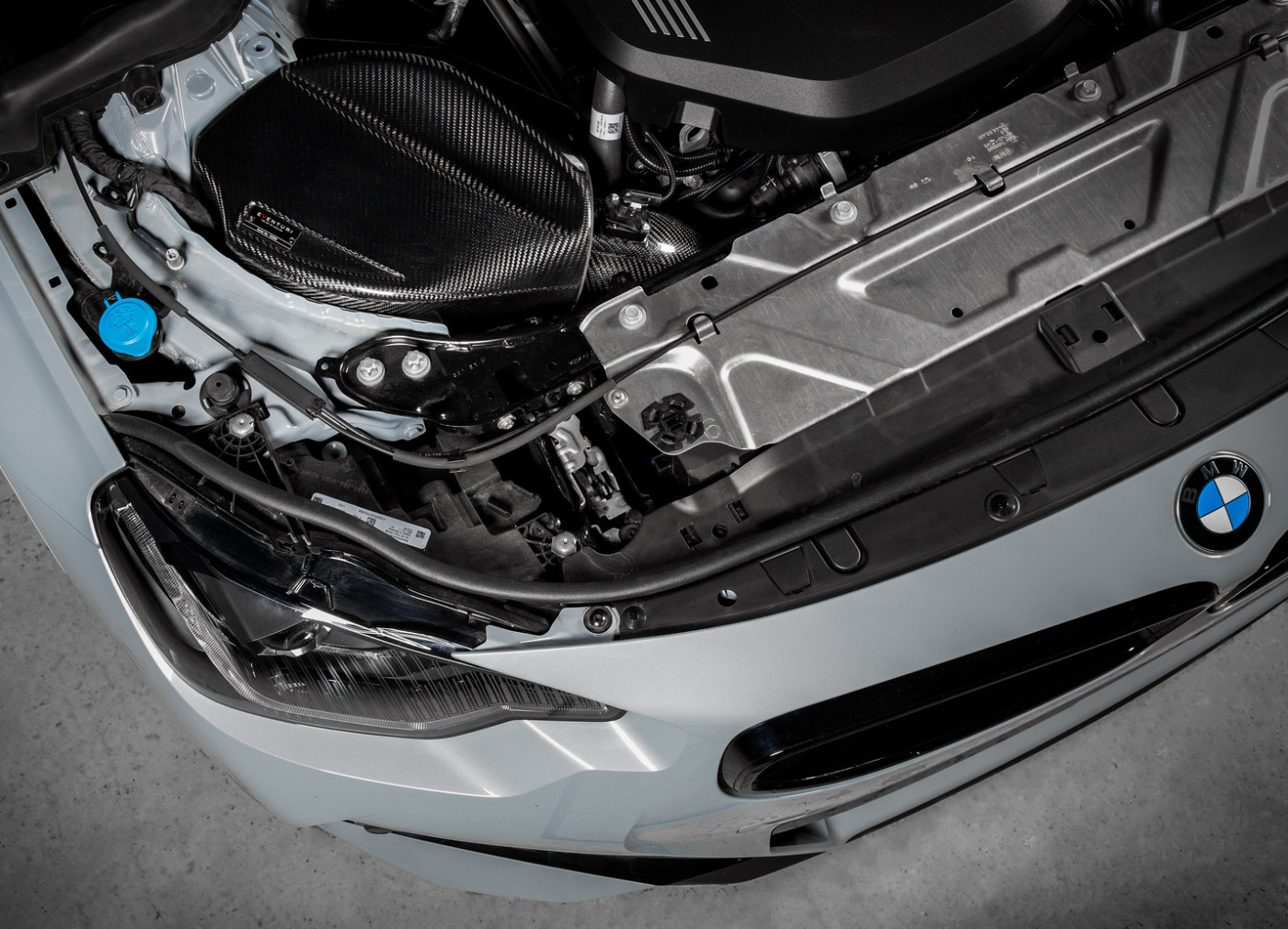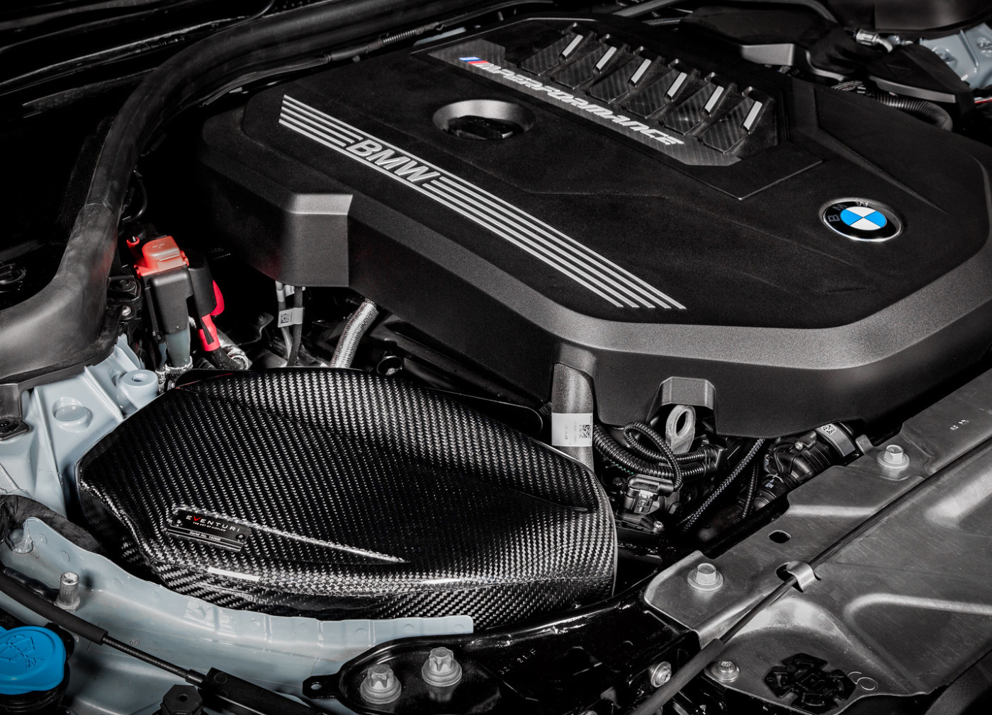 Eventuri kit sání pro BMW řady 3 G20 s motorem B58 je dalším z kompletních systémů vedení nasávaného vzduchu do motoru. Jedná se o kompletně uzavřený kit sání, který zajišťuje, že turbodmychadlo nenasává horký vzduch z motorového prostoru. Celé sání je navrženo tak, aby přivádělo vzduch do motoru co možná nejméně restriktivní cestou. Protože je sání umístěno továrně v blízkosti výfukových svodů, je pro jeho funkci zcela zásadní přívod čerstvého vzduchu, který spolu s airboxem z prepreg karbonu udržuje teplotu nasávaného vzduchu na minimální možné úrovni. Kromě továrního přívodu vzduchu využívá Eventuri další zdroj v podobě otvoru v podběhu kola. Proti výfukovým svodům pak míří i tepelný štít se zlatou reflektivní tepelnou izolací.