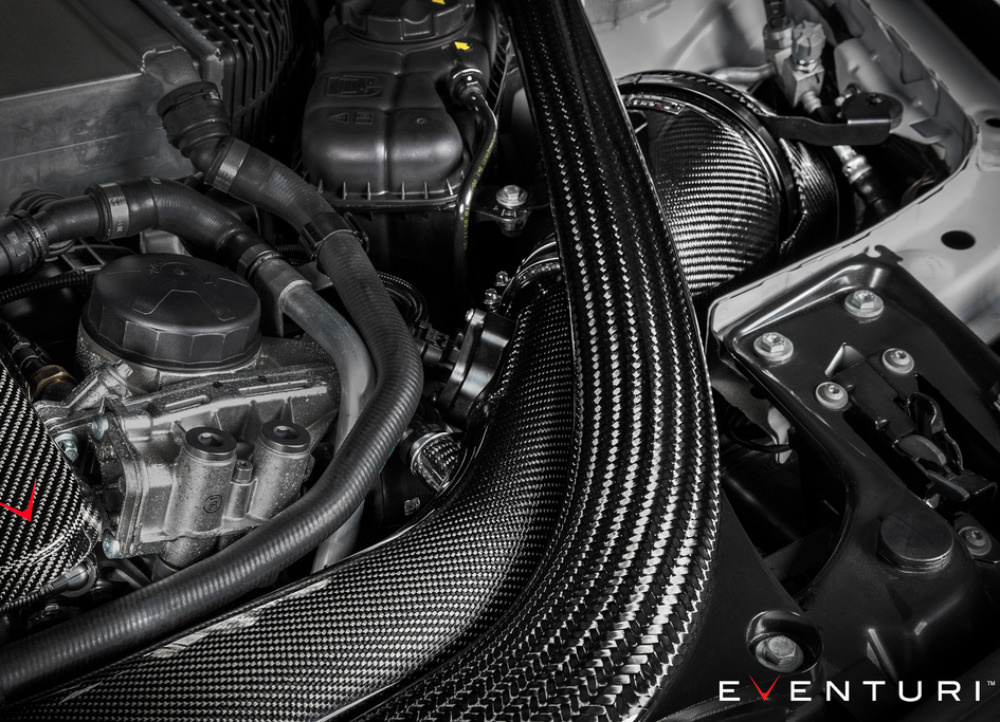 Kit sání Eventuri pro BMW M2 Competition je navržen tak, aby zvyšoval efektivitu turbodmychadel. Originální airboxy jsou kompletně nahrazeny patentovanými airboxy Eventuri s plynulým vedením vzduchu, které přecházejí do trubek vedení vzduchu vyrobených stejně jako airboxy z prepreg karbonu. Trubice vedení vzduchu obsahují také adaptér pro umístění MAF senzorů. Tyto adaptéry jsou vyrobeny CNC obráběním z hliníku a eloxovány do černé barvy. Protože M2 Competition nemá otvory pro přívod vzduchu z masky chladiče, navrhli jsme také utěsněné nasávače čerstvého vzduchu, které uzavírají oba airboxy.