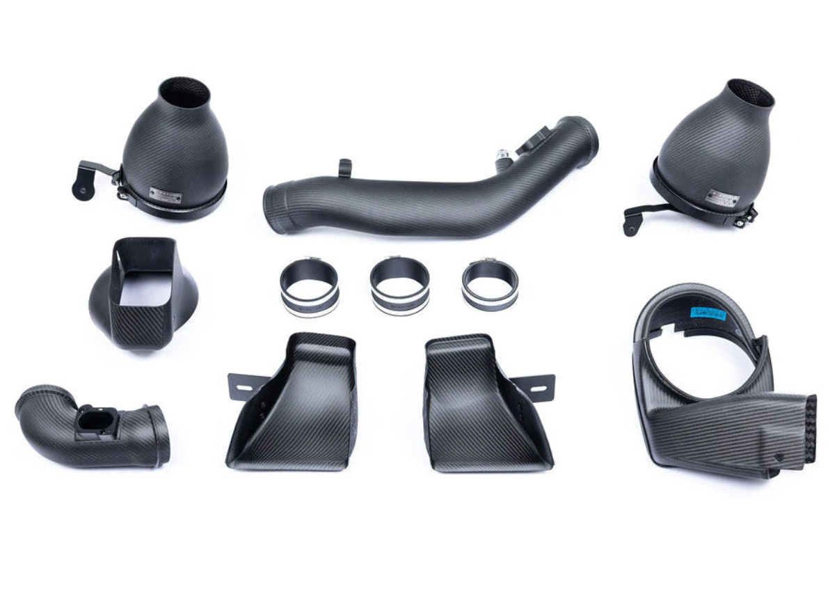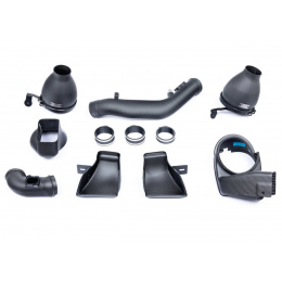 Maximálním využitím prostoru pod kapotou, který nově vyplňují karbonové airboxy s patentovaným tvarem a reverzně umístěnou filtrační vložkou, se zvětšila filtrační plocha o 40% oproti továrním filtrům. Vnější obal airboxu funguje jako redukce průměru až po vstup do turba, takže vzduch proudí plynule a bez restrikcí. Samotné vstupy do turbodmychadel jsou pak větší dokonce o 160% oproti továrním a na vnitřní straně mají unikátní ďolíčkový povrch, díky kterému nedochází ke zpomalování proudění vzduchu vlivem tření s vnitřní stěnou. Vzduch tak proudí rychleji do turbodmychadel a nedochází ke ztrátě tlaku.