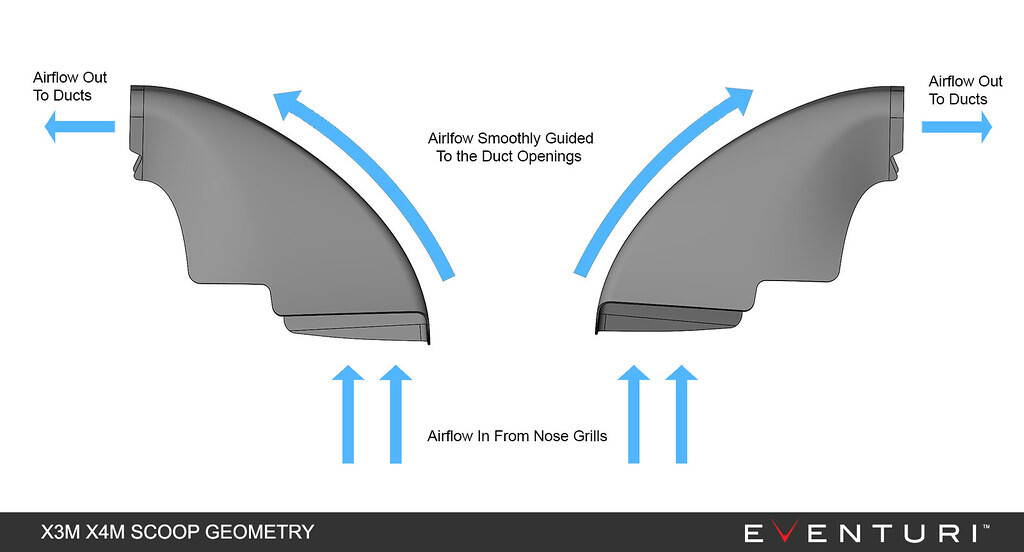 Ačkoliv je sání pro BMW X3M / X4M na první pohled nevzhledné, jedná se o chytře navržený způsob přívodu vzduchu do motoru. Vedení vzduchu od filtrů k turbodmychadlu je velmi přímé a nemění směr, jako tomu bývá u konvenčních airboxů sání. V tomto případě se tedy Eventuri spíše než na kompletní změnu vedení vzduchu a výměnu airbocu zaměřilo na vylepšení stávajícího řešení s ohledem na lepší propustnost vzduchu a efektivnější izolaci proti prostupování tepla do sání. Tovární filtry jsou tak nahrazeny sportovními filtry s lepší propustností při zachování špičkových filtračních schopností. Snížení teploty nasávaného vzduchu pak pomáhají karbonové difuzory umístěné za maskou chladiče, které k filtrům přivádějí dostatek čerstvého vzduchu. Posledním dílem je pak karbonový kryt motoru, který sice nemá vliv na výkon samotného sání, ale podporuje jeho výraznější zvuk a také vypadá skvěle v motorovém prostoru.