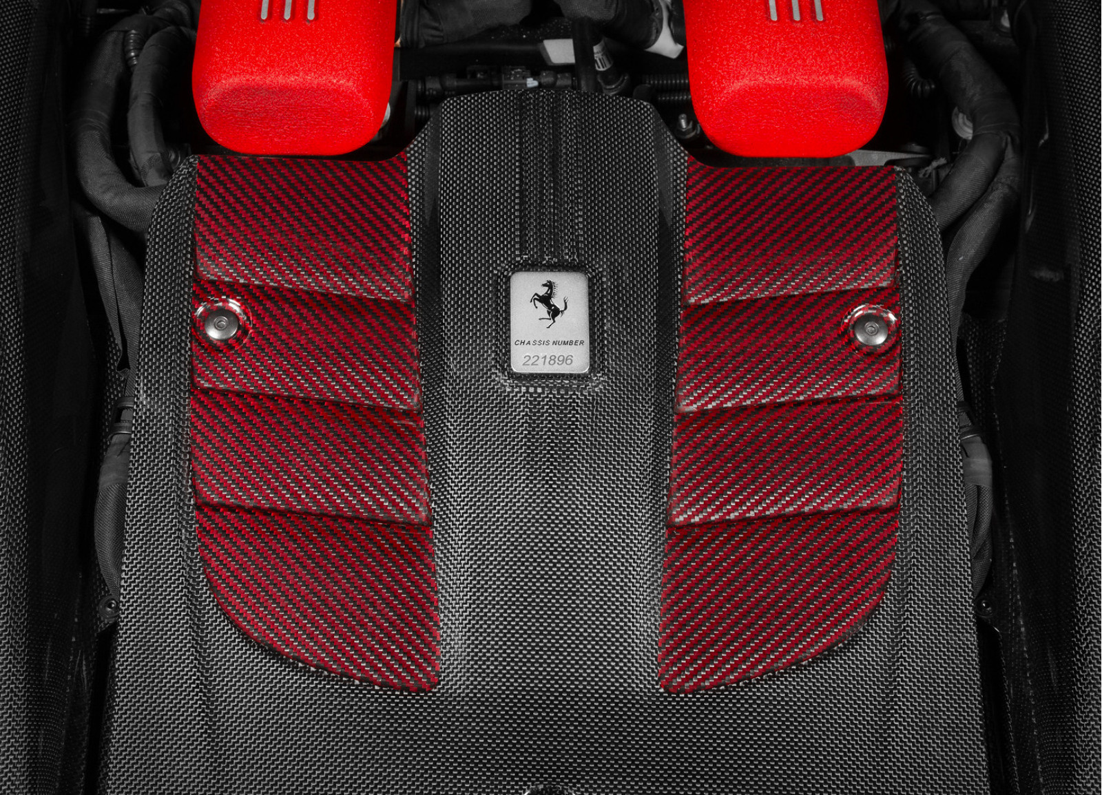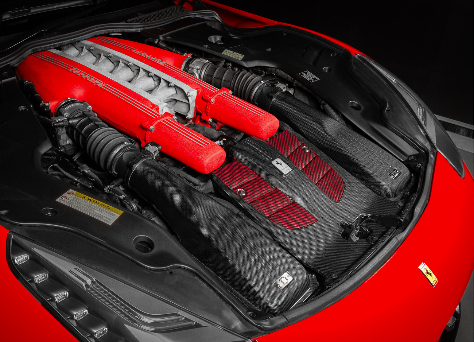 Dokonalý design pod kapotou je dotvářen také centrálním krytem, který je vyroben z karbonu a červeného kevlaru, který designově navazuje na charakteristické červeně lakované sací svody motoru 6,3 l V12.