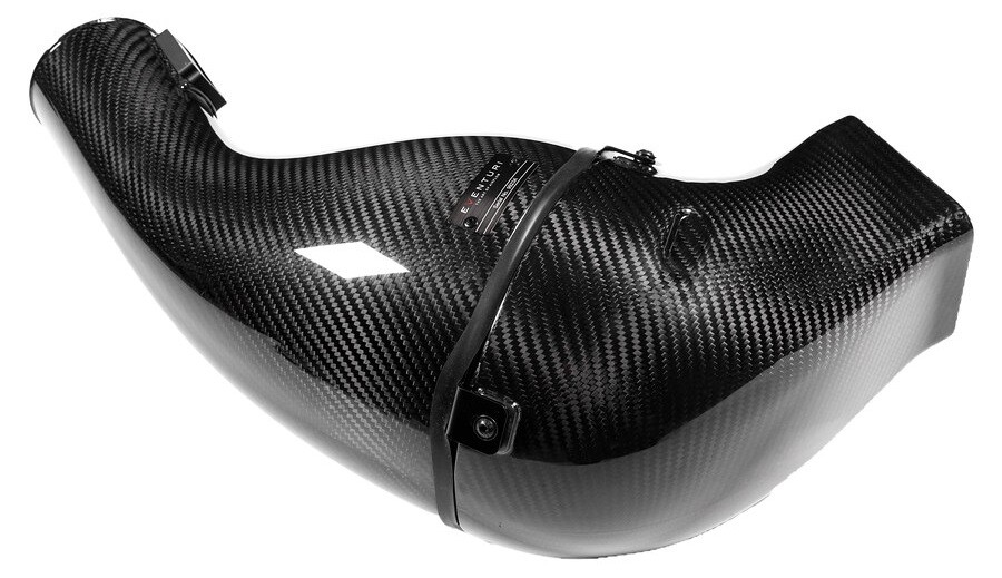 Karbonové vedení Eventuri pro Lamborghini Huracan uzavírá a utěsňuje airbox a zároveň přivádí čerstvý nasávaný vzduchu k filtru uvnitř airboxu. Jeho konstrukce z prepreg karbonu a neoprénovému těsnění v místě napojení k airboxu zabraňuje pronikání tepla do sání.