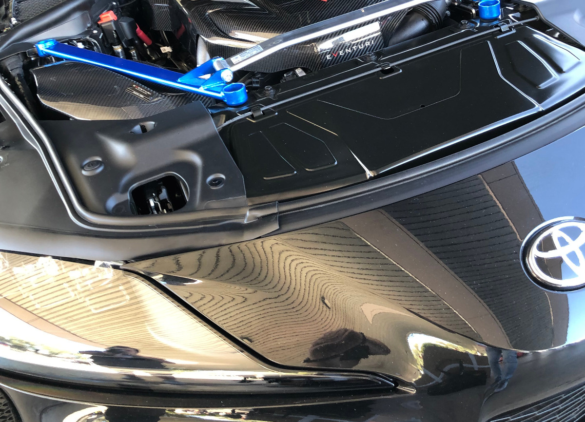 Karbonové sání Eventuri pro vůz Toyota Supra A90 (MK5) bylo vyvinuto tak, aby zásobovalo turbo maximálním možným množstvím vzduchu, proudícím co možná nejméně restriktivním způsobem a zachovávajícím si co nejnižší teplotu nasávaného vzduchu. Vzhledem k tomu, že sání vzduchu je u Toyota Supra umístěno v blízkosti výfukových svodů, je funkčním řešením sportovního sání pouze uzavřený airbox s odstíněním od zdroje tepla. Právě prolínání horkého vzduchu od svodů do sání je hlavní problém originálního airboxu. Dalším je samotný zdroj čerstvého vzduchu, protože Supra je originálně vybavena pouze jedním vstupem vzduchu do airboxu. Karbonové sání Eventuri má proti tomu vstupy dva a pro závodní použití pak nabízí náhradu světlometu, která po odstranění krytu na airboxu znamená další přívod vzduchu. Jako dodatečná ochrana před teplým vzduchem je na straně výfukových svodů airbox opatřen tepelným štítem se zlatou termoizolací.