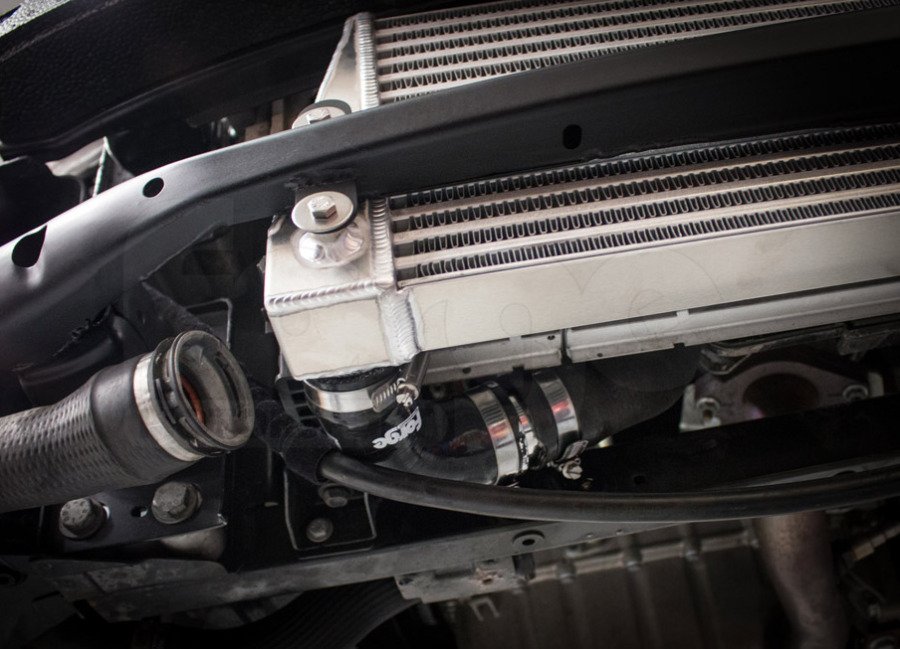 Originální řešení dvojitého intercooleru zapojeného paralelně není samo o sobě špatné, ale má své limity. Forge kit odstraňuje dlouhá vedení vzduchu s malým průměrem a zároveň výrazně zvětšuje aktivní plochu chladiče. Výsledkem je nižší odpor v proudění vzduchu, lepší průchodnost soustavy a hlavně efektivnější chlazení nasávaného vzduchu. To se projeví stabilnějším výkonem, lepší odezvou a větší rezervou pro další úpravy.