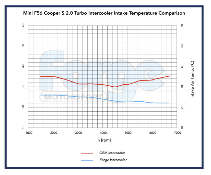 Vysoce výkonný intercooler (mezichladič stlačeného vzduchu) Forge Motorsport pro vozy Mini F56 JCW je navržen jako účinná náhrada sériového chladiče, který u těchto motorů často představuje limit při sportovní jízdě i při úpravách výkonu. Díky většímu jádru zajišťuje stabilnější teploty nasávaného vzduchu a konzistentnější výkon i při opakované zátěži.