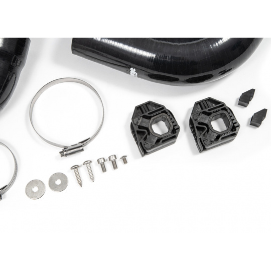 Po zvětšení průměrů intercooleru se pozornost Forge Motorsport zaměřila na navazující silikonové hadice. Ty byly vytvořeny se stupňovitým vstupem tak, aby po nasazení na příruby intercooleru vznikl zcela plynulý přechod bez turbulencí. Silikonové vedení navazuje průměrem 76 mm na nové příruby, což oproti továrním 63 mm znamená: