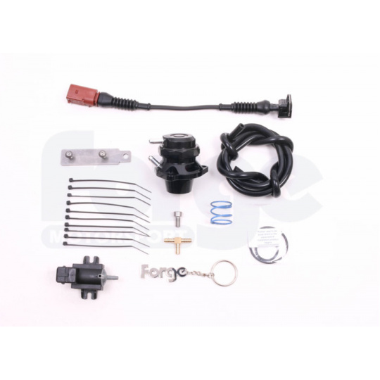 Kompletní sada odfukového Blow Off Ventilu (BOV) Forge Motorsport pro koncernové motory 1.8 a 2.0 TSI 3. generace (2013+), včetně modelu VW Golf 7 R. Ventil má otevřenou konstrukci, takže přebytečný vzduch slyšitelně odfukuje do okolí (na rozdíl od uzavřených recirkulačních ventilů).