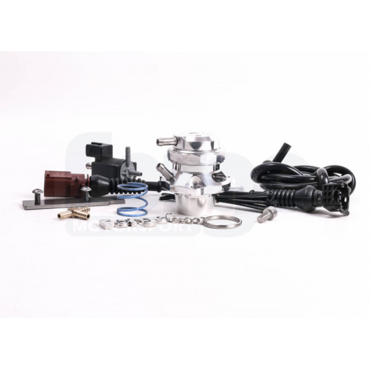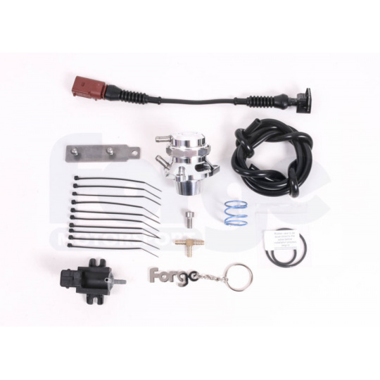 Kompletní sada odfukového Blow Off Ventilu (BOV) Forge Motorsport pro koncernové motory 1.8 a 2.0 TSI 3. generace (2013+), včetně modelu VW Golf 7 R. Ventil má otevřenou konstrukci, takže přebytečný vzduch slyšitelně odfukuje do okolí (na rozdíl od uzavřených recirkulačních ventilů).