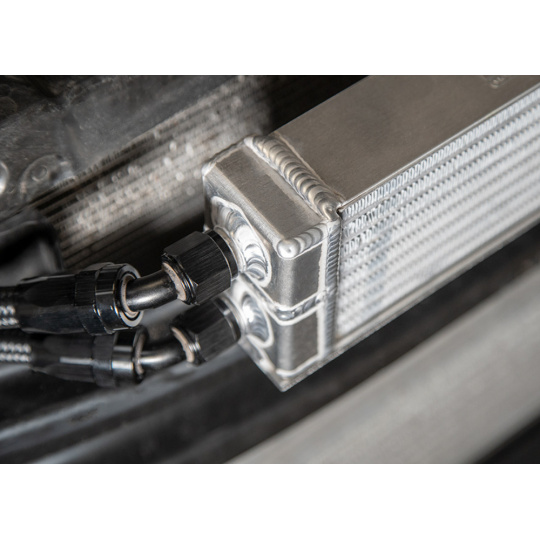 Na rozdíl od mnoha alternativních řešení zachovává FMOC12 také tovární výměník olej–voda, čímž se v reálném provozu zvyšuje celková kapacita chlazení. Součástí sady je laserem řezaný držák přesně pasující na nárazovou příčku vozu, předpřipravené hadice AN-8 a sendvičový adaptér s termostatem. Instalace je díky tomu přímá a bez úprav.