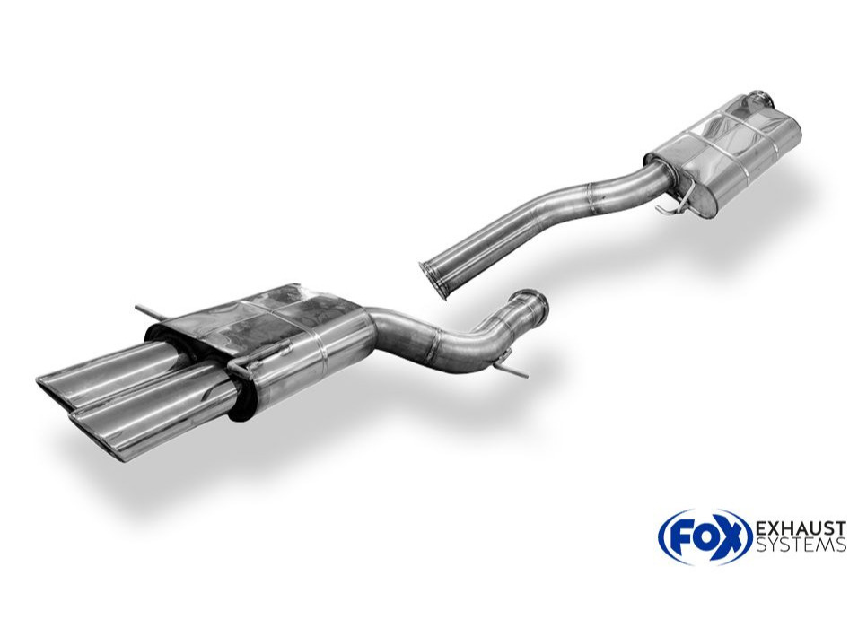 Fox Sportauspuff koncový a středový tlumič včetně Y-adaptéru pro připojení na originální downpipe s koncovkou 2x106x71 Typ 32 dvojitá pro Audi RS4 B5 s motorem 2.7