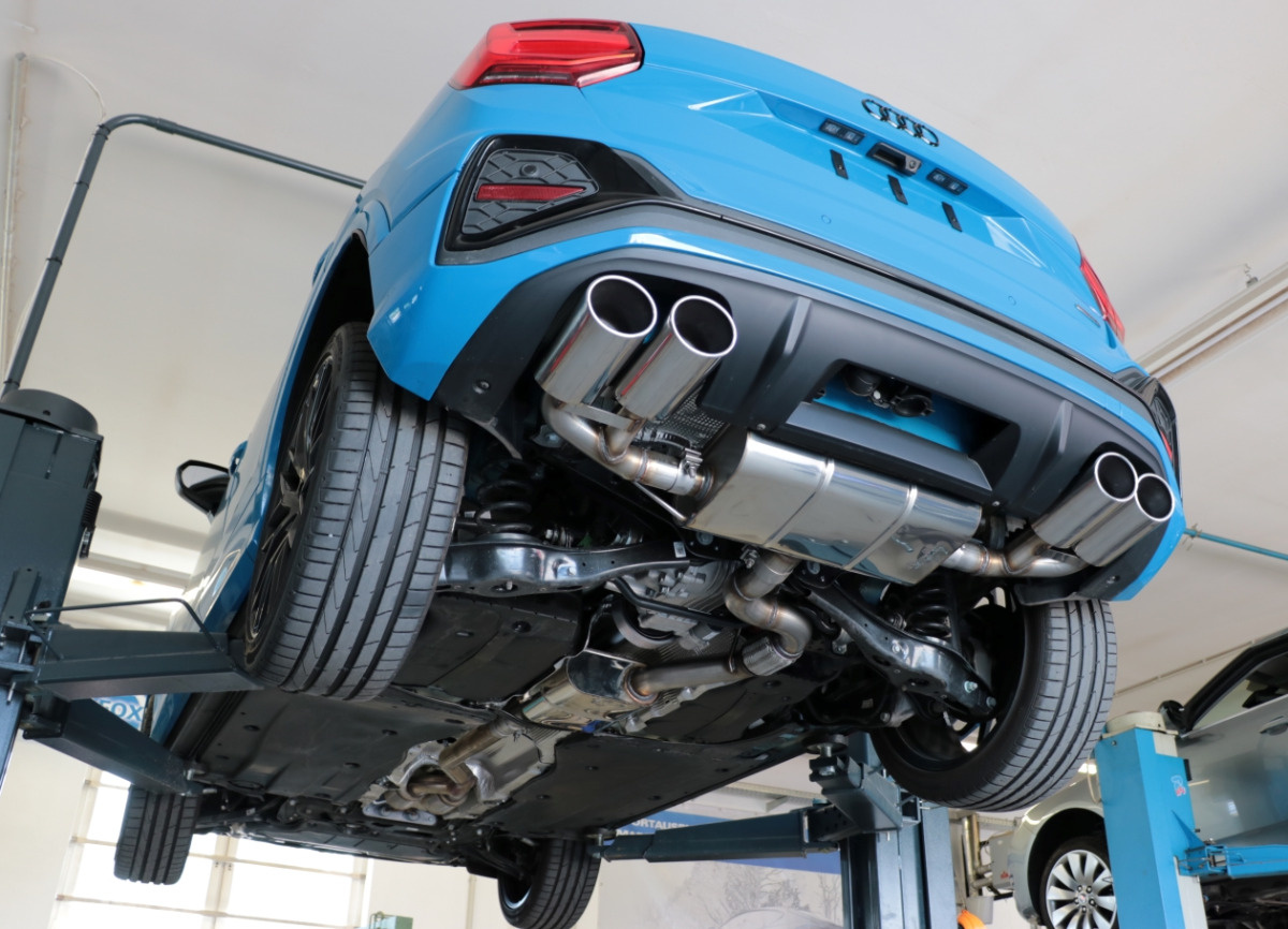 Fox Sportauspuff koncový tlumič výfuku včetně předního tlumiče s koncovkou 2x115x85 Typ 32 na obou stranách pro Audi Q2 2019- s motorem 2.0