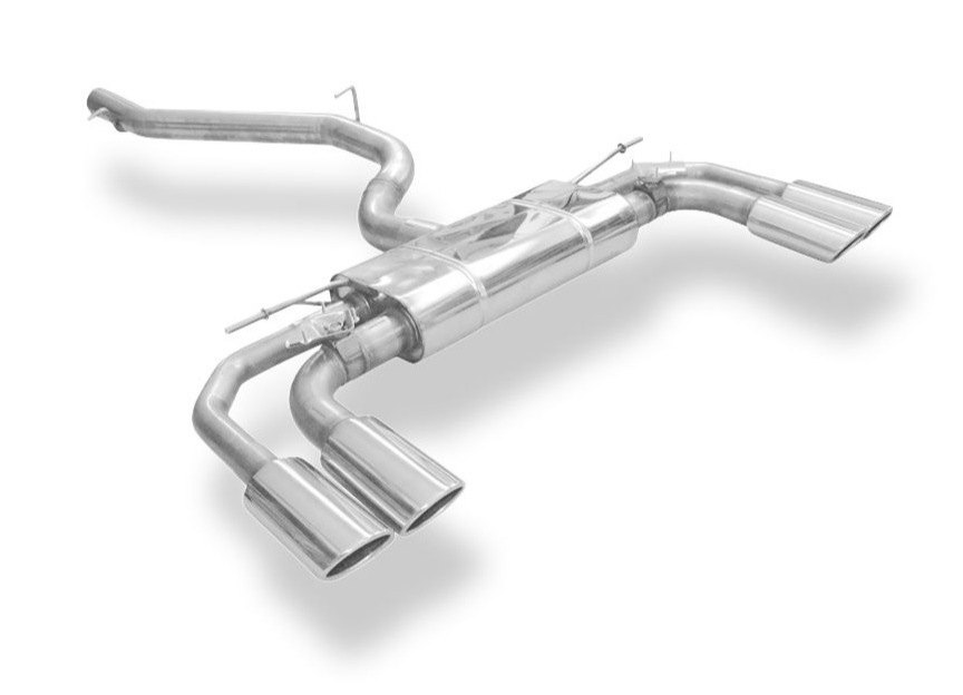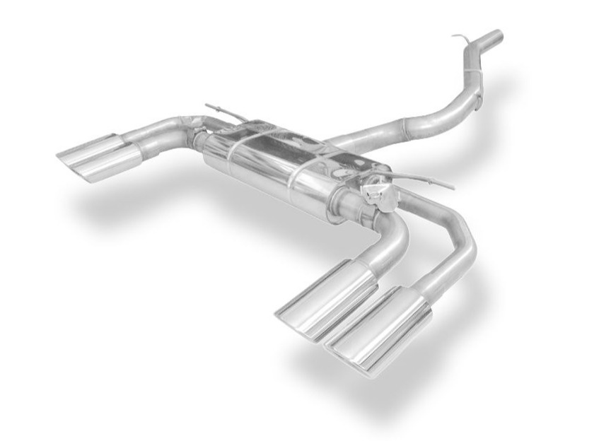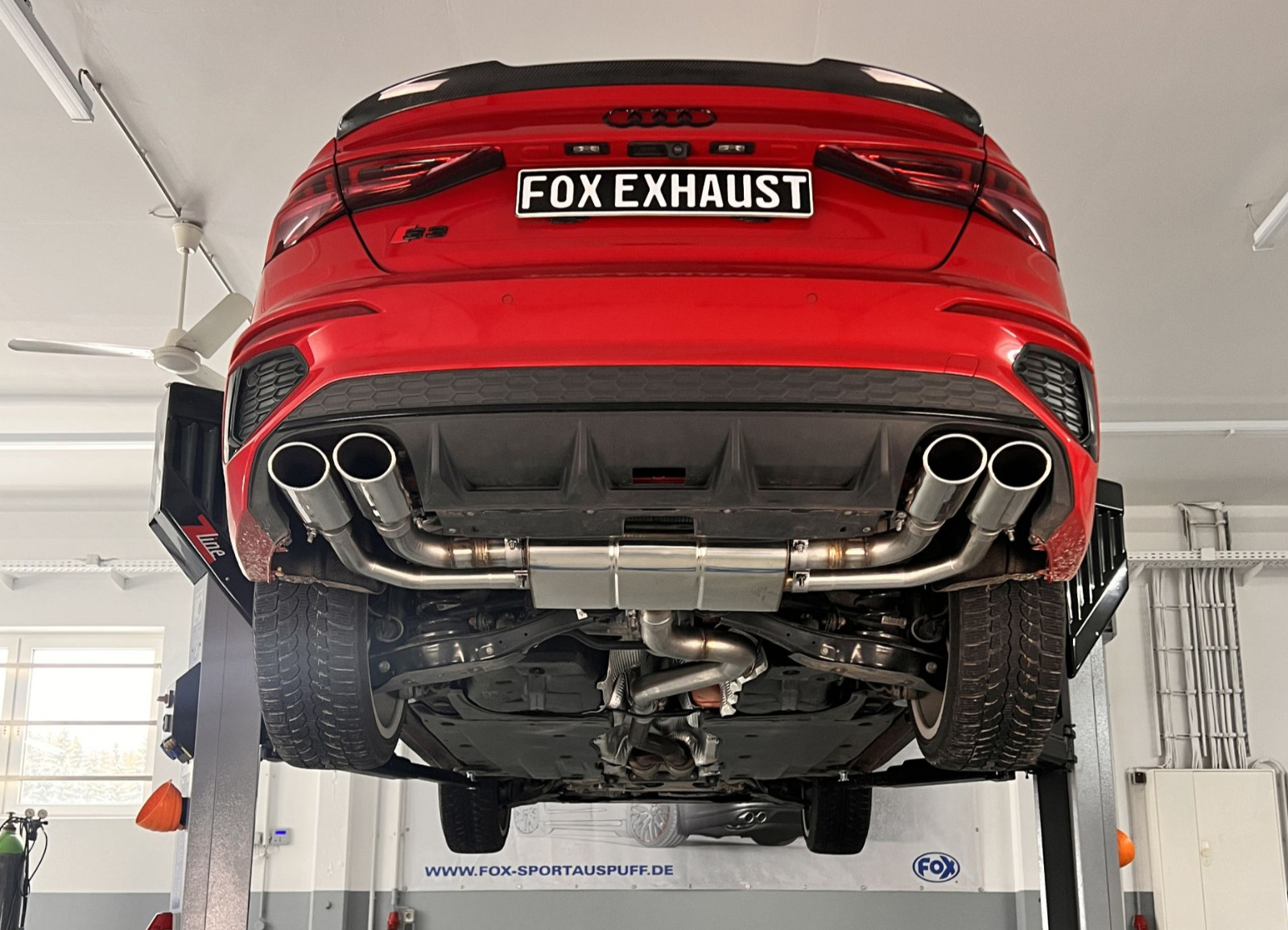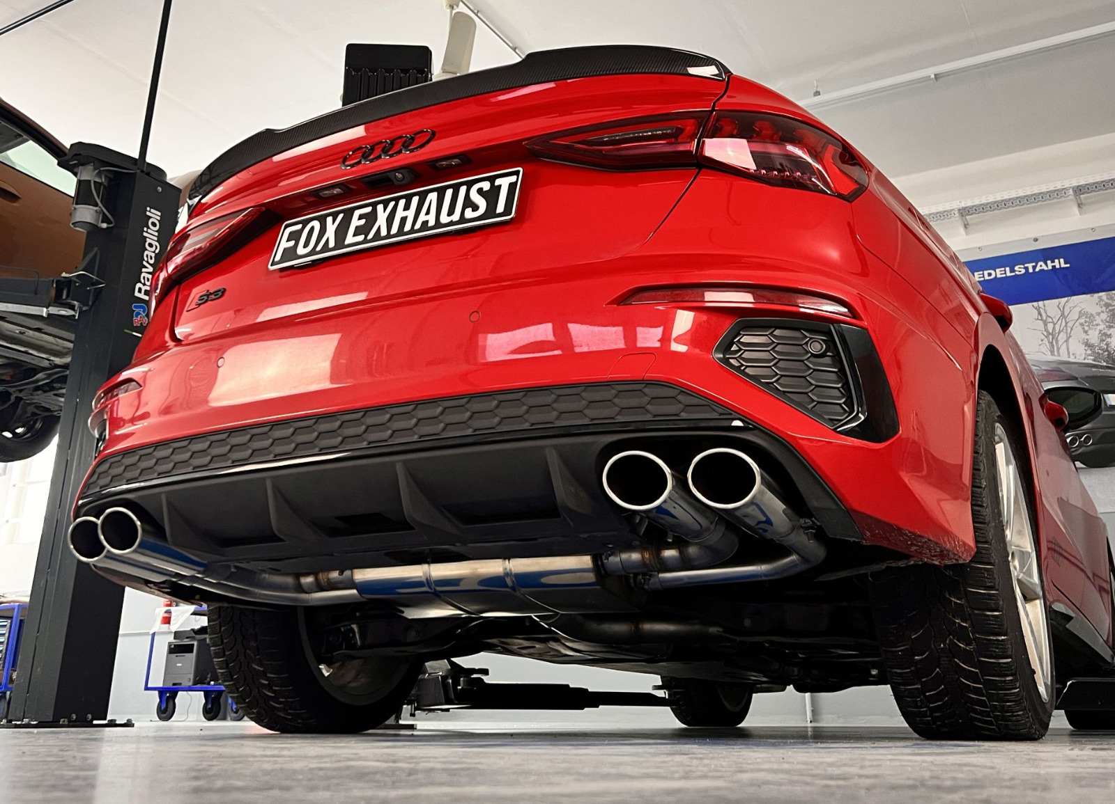 Fox Sportauspuff poloviční výfukový systém od katalyzátoru s výfukovými klapkami s koncovkou 2x106x71 Typ 44 na obou stranách pro Audi S3 GY 2020- s motorem 2.0 l