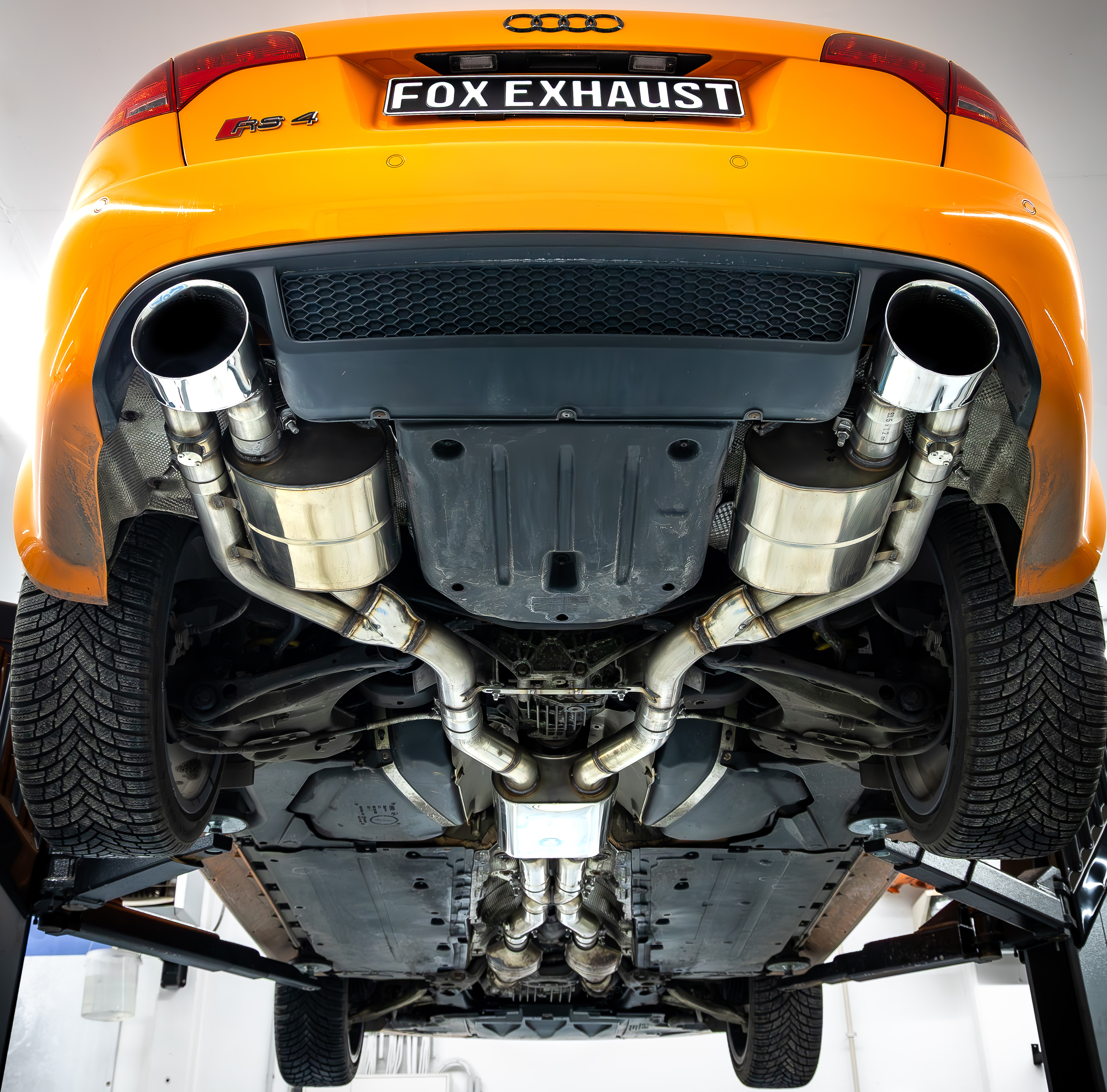 Fox Sportauspuff výfukový systém od katalyzátoru s klapkami s koncovkou 160x130 oválné na obou stranách pro Audi S4 B7 s motorem 4.2 l