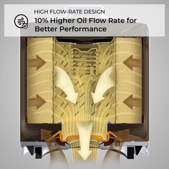Vrstvené syntetické filtrační médium účinně zachytává nežádoucí částice v olejové soustavě a zároveň je navrženo pro maximální průtok. Tím zajišťuje dostatečné mazání pro namáhané části motoru.