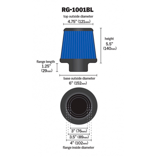 ZÁKLADNÍ ROZMĚRY A PARAMETRY UNIVERZÁLNÍHO FILTRU K&N RG-1001BL