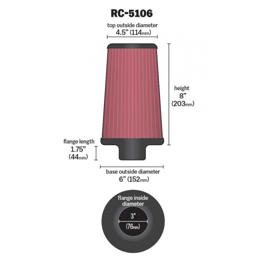 ZÁKLADNÍ ROZMĚRY A PARAMETRY UNIVERZÁLNÍHO FILTRU K&N RC-5106