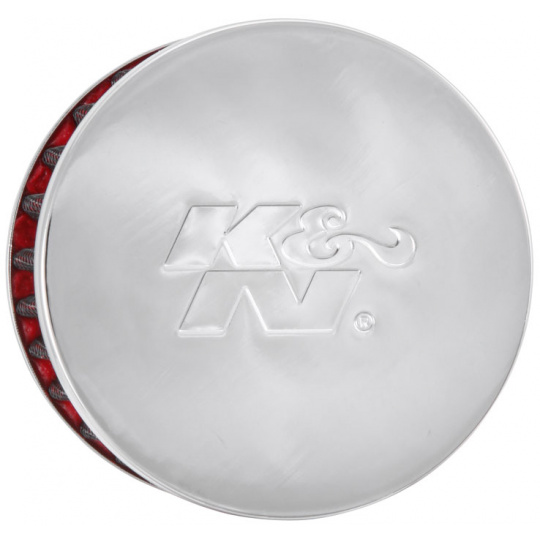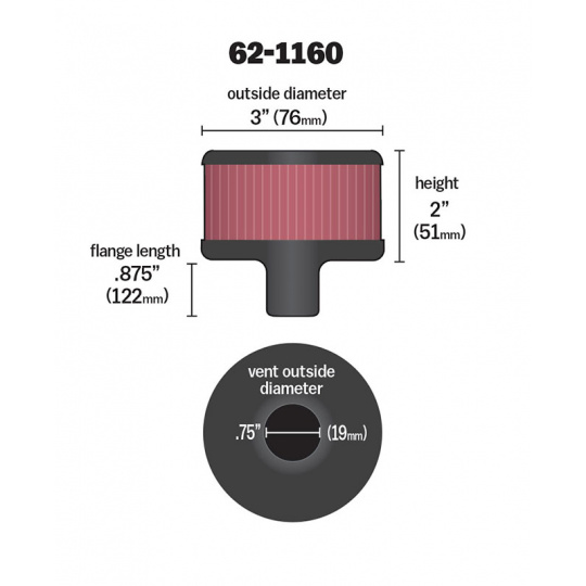 K&N univerzální odvětrávací filtr s vnějším průměrem 76 mm a výškou 51 mm, průměr vstupu 19 mm, délka vstupní příruby 22 mm, materiál Netkaná syntetická textilie, vrchlík kovový vrchlík