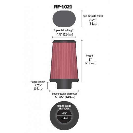 ZÁKLADNÍ ROZMĚRY A PARAMETRY UNIVERZÁLNÍHO FILTRU K&N RF-1021