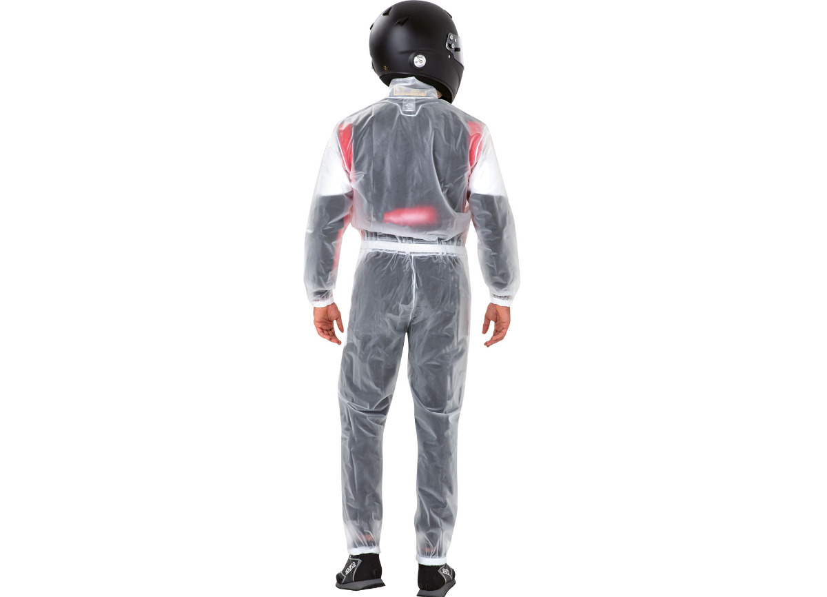 Kartingová pláštěnka na kombinézu, čirá. Podlepené švy pro maximální ochranu proti vodě. Průhledný design umožňuje prezentaci sponzorů v dešti. Žádné žloutnutí, ani s intenzivním používáním.