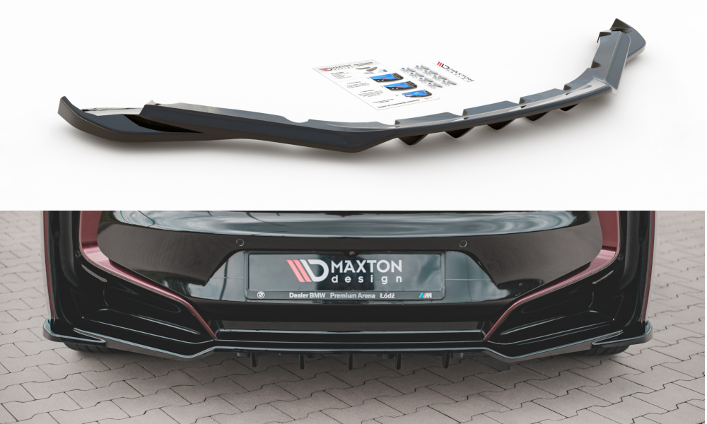 Maxton Design středový spoiler pod zadní nárazník s žebrováním pro BMW i8, černý lesklý plast ABS