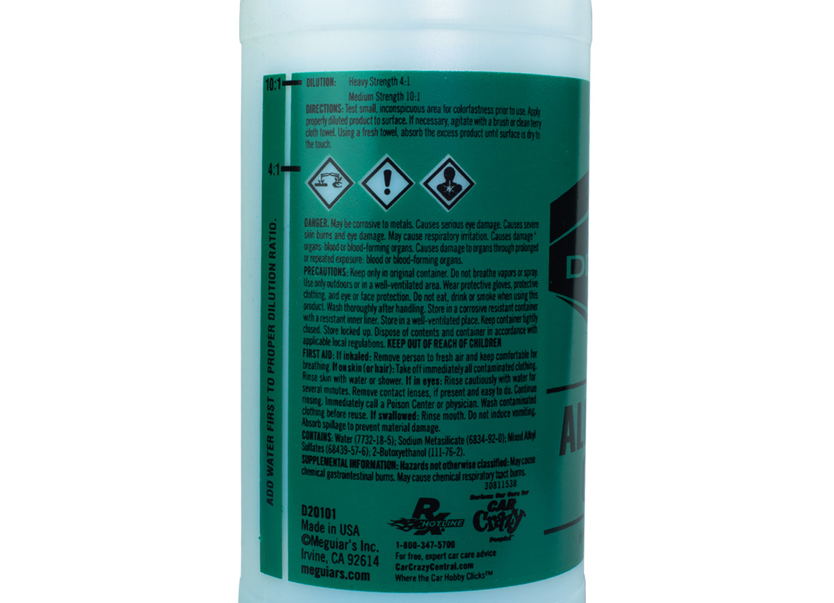 Ředicí láhev pro D101 Meguiar's All Purpose Cleaner. Barevné označení a popis odpovídající produktu zajišťuje snadnou identifikaci. Rysky na láhvi umožňují velmi snadné a rychlé naředění produktu do požadovaného poměru.