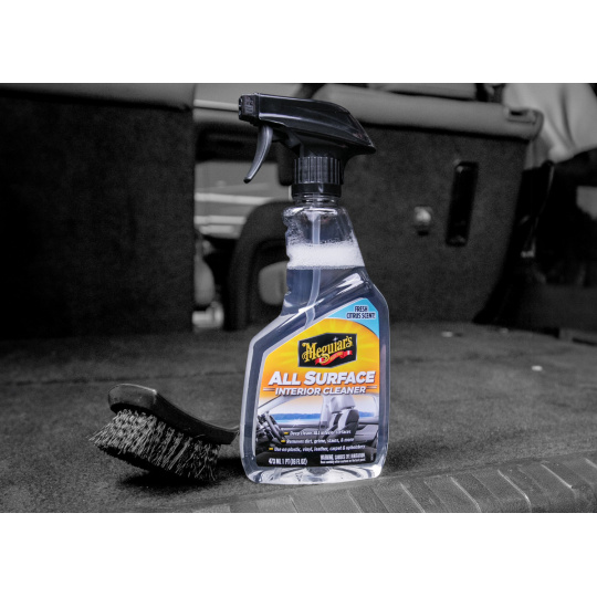 Meguiar's All Surface Interior Cleaner je nejrychlejší cesta k vyčistění všech interiérových povrchů. Je zcela bezpečný pro použití na všech plastových, vinylových, gumových i kožených částech. Účinně a jednoduše odstraňuje odolnou špínu, každodenní nečistoty, skvrny, rozlité tekutiny, otisky prstů a další nečistoty. Po použití zanechává čistý, originální, matný povrch.