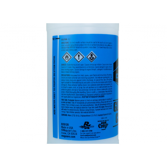 Ředicí láhev pro D120 Meguiar's Glass Cleaner Concentrate. Barevné označení a popis odpovídající produktu zajišťuje snadnou identifikaci. Rysky na láhvi umožňují velmi snadné a rychlé naředění produktu do požadovaného poměru.