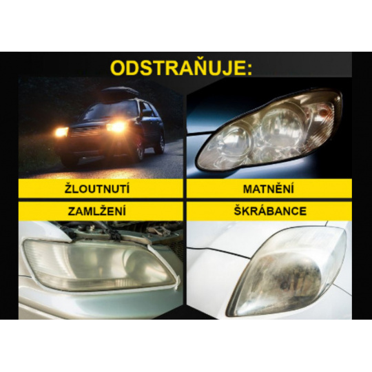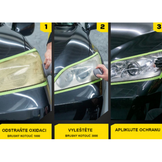 Tato sada na čištění a ochranu světlometů odstraňuje mírné až silné zažloutnutí, oxidaci a obnovuje jejich průhlednost. Po odstranění zažloutnutí a oxidace pomocí 2 hrubostí brusného papíru je v této sadě také sealant, který obsahuje UV ochranu před opětovnou oxidací až na 18+ měsíců. Není potřeba žádné nářadí ani elektrické nástroje.