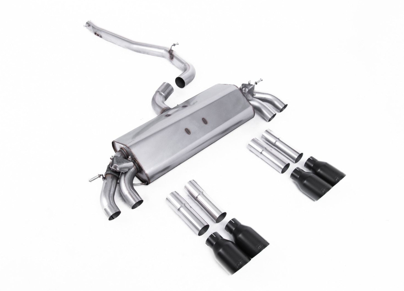 Milltek Sport výfukový systém cat-back bez rezonátoru (hlasitější) pro Audi S3 2.0 TFSI quattro Sedan/Cabrio 8V/8V.2 (bez GPF) 2013-2018, dvojité, kulaté, typ koncovek: GT-100 černé