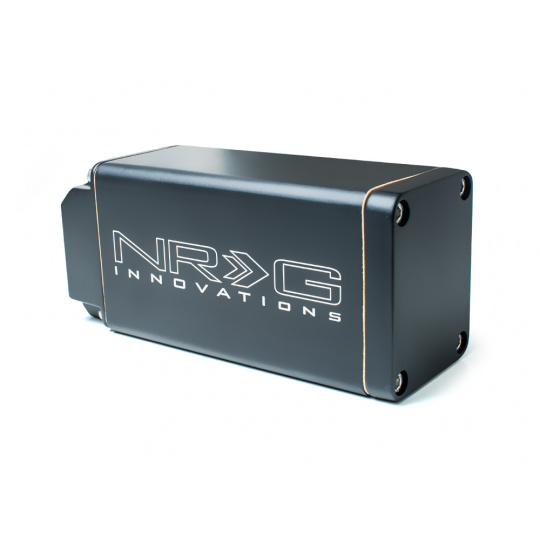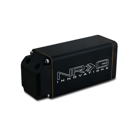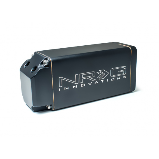 Oil catch tank NRG Innovations pro zachytávání olejových par z přepadu zpět do sání. Černé matné provedení se dvěma vývody a kontrolním ukazatelem hladiny oleje v nádobce.