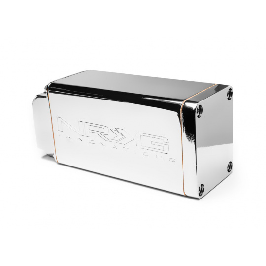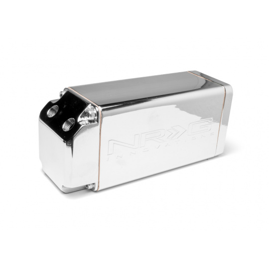 Oil catch tank NRG Innovations pro zachytávání olejových par z přepadu zpět do sání. Chromové (leštěné) provedení se dvěma vývody a kontrolním ukazatelem hladiny oleje v nádobce.
