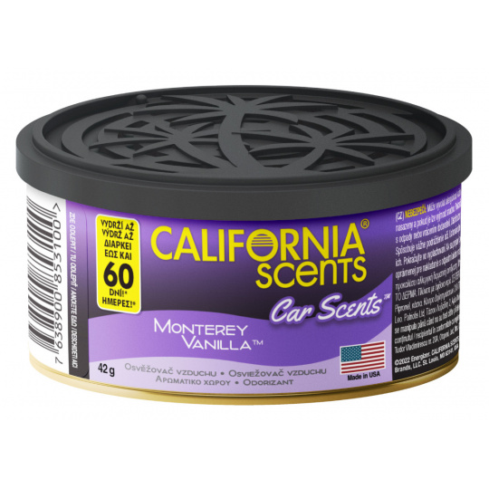Luxusní, smyslné, trvanlivé a intenzivní vůně do auta California Scents jsou tu aby vám dokázaly, co znamená opravdu dlouhotrvající přijemná vůně ať už ve vašem voze, domácnosti nebo kanceláři. Každá plechová dóza Car Scents® obsahuje tři bloky lisovaného lnu napuštěného parfémem. Vzhledem k pevné konzistenci osvěžovače California Scents tak nehrozí únik tekutiny následovaný nepříjemným poleptáním plasotvého povrchu . V neposlední řadě je třeba zmínit, že tyto produkty California Scents jsou velmi šetrné k životnímu prostředí. Obal je tvořen recyklovatelným hliníkem a obsah (lněné bloky) je pak díky svému přírodnímu původu plně biologicky odbouratelný.