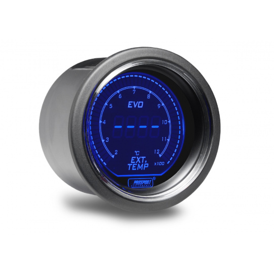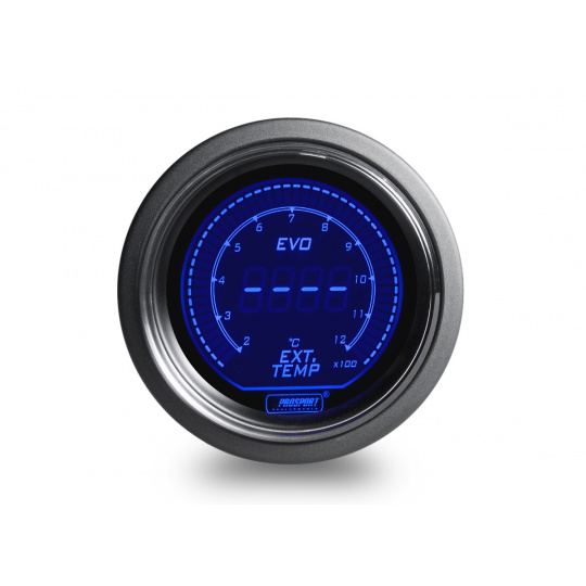 Přídavný ukazatel teploty výfukových plynů (EGT) Prosport Performance s rozsahem 200 až 1200°C ze série EVO. Série EVO přináší futuristický vzhled do Vašeho interiéru.Podsvícení je možné přepínat mezi červeným a modrým a ideálně tak sladit vzhled budíku s interiérem vozu. Při otočení klíčku proběhne u každého budíku uvítací ceremoniál, při kterém je prověřen pohyb ručky v celém rozsahu (Scan). Poté se budík ustálí ve Vámi zvoleném barevném nastavení. Ve vypnutém stavu je displej budíku vypnutý a je viditelná pouze obvodová linka a logo Prosport Performance.