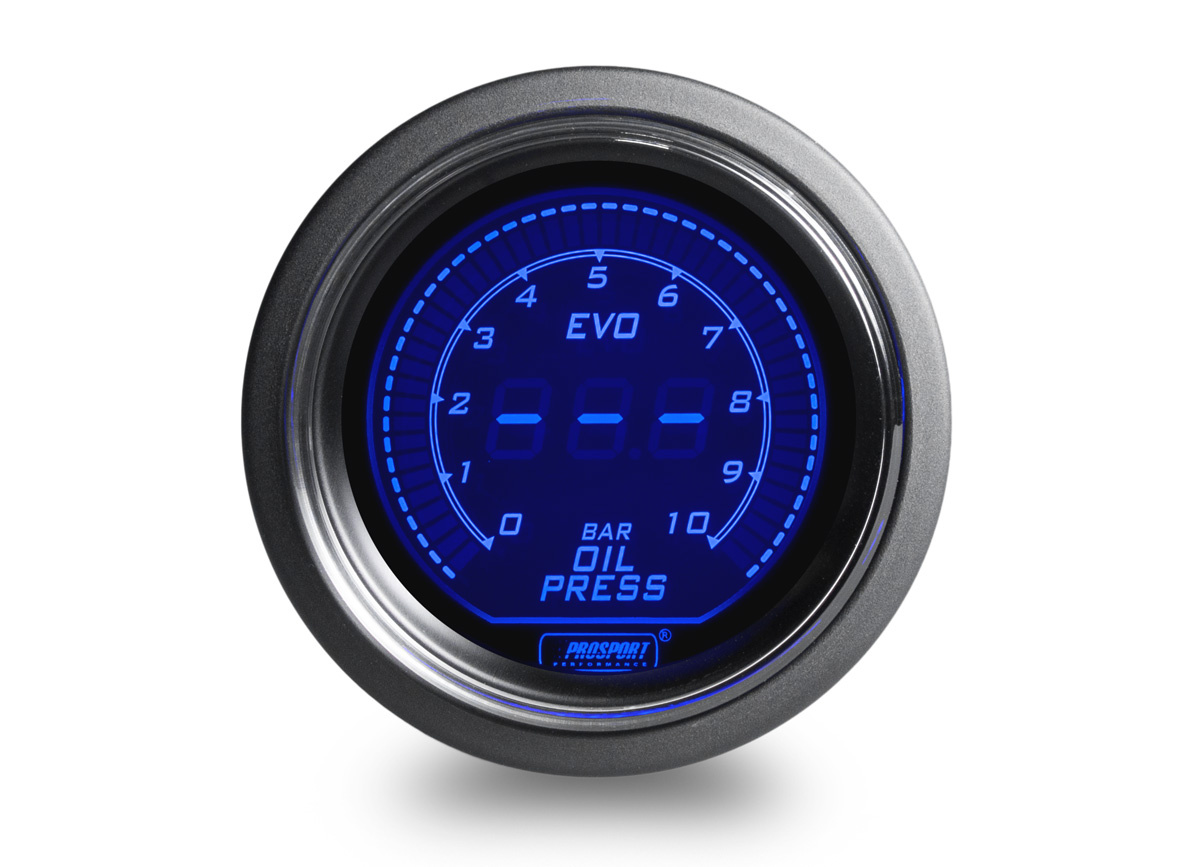 Přídavný ukazatel tlaku oleje Prosport Performance s rozsahem 0 až 10 bar ze série EVO. Série EVO přináší futuristický vzhled do Vašeho interiéru.Podsvícení je možné přepínat mezi červeným a modrým a ideálně tak sladit vzhled budíku s interiérem vozu. Při otočení klíčku proběhne u každého budíku uvítací ceremoniál, při kterém je prověřen pohyb ručky v celém rozsahu (Scan). Poté se budík ustálí ve Vámi zvoleném barevném nasta vení. Ve vypnutém stavu je displej budíku vypnutý a je viditelná pouze obvodová linka a logo Prosport Performance.