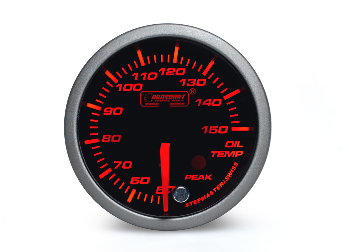 Přídavný ukazatel teploty oleje Prosport Performance ze série Premium. Ukazatel je vybaven krokovým motorkem, který zaručuje maximální přesnost. Zároveň umožňuje nastavit špičkovou hodnotu, při jejímž dosažení se ukazatel zbarví do červena, rozsvítí varovnou diodu a ozve se zvukový signál.Podsvícení je možné přepínat mezi červeným a bílým a ideálně tak sladit vzhled budíku s interiérem vozu. Při otočení klíčku proběhne u každého budíku uvítací ceremoniál, při kterém je prověřen pohyb ručky v celém rozsahu (Scan), varovná LED dioda a funkčnost zvukového signálu. Poté se budík ustálí ve Vámi zvoleném barevném nastavení.