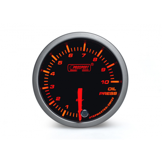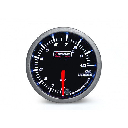 Přídavný ukazatel tlaku oleje Prosport Performance ze série Premium. Ukazatel je vybaven krokovým motorkem, který zaručuje maximální přesnost. Zároveň umožňuje nastavit špičkovou hodnotu, při jejímž dosažení se ukazatel zbarví do červena, rozsvítí varovnou diodu a ozve se zvukový signál.Podsvícení je možné přepínat mezi červeným a bílým a ideálně tak sladit vzhled budíku s interiérem vozu. Při otočení klíčku proběhne u každého budíku uvítací ceremoniál, při kterém je prověřen pohyb ručky v celém rozsahu (Scan), varovná LED dioda a funkčnost zvukového signálu. Poté se budík ustálí ve Vámi zvoleném barevném nastavení.
