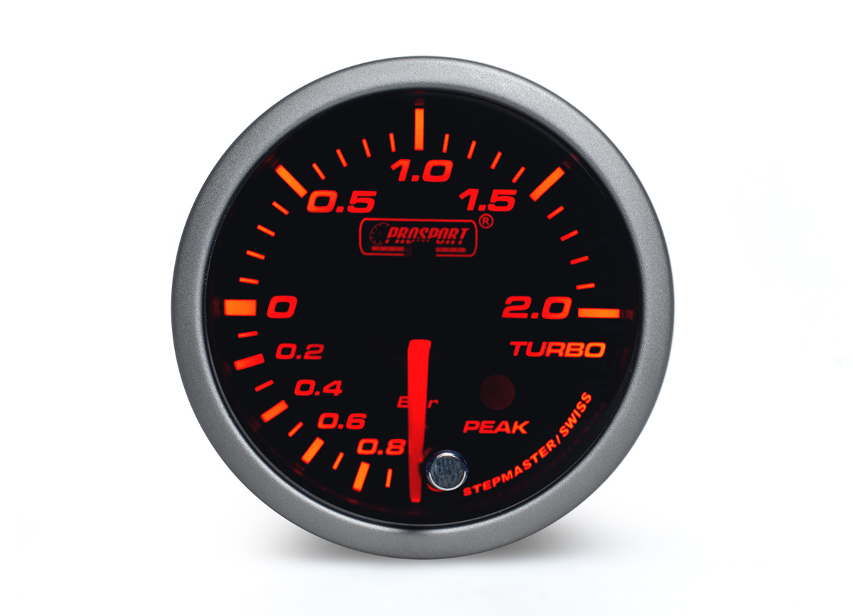 Přídavný ukazatel tlaku turba Prosport Performance - elektronický s rozsahem -1 až +2 bar ze série Premium. Ukazatel je vybaven krokovým motorkem, který zaručuje maximální přesnost. Zároveň umožňuje nastavit špičkovou hodnotu, při jejímž dosažení se ukazatel zbarví do červena, rozsvítí varovnou diodu a ozve se zvukový signál. Podsvícení je možné přepínat mezi červeným a bílým a ideálně tak sladit vzhled budíku s interiérem vozu. Při otočení klíčku proběhne u každého budíku uvítací ceremoniál, při kterém je prověřen pohyb ručky v celém rozsahu (Scan), varovná LED dioda a funkčnost zvukového signálu. Poté se budík ustálí ve Vámi zvoleném barevném nastavení.