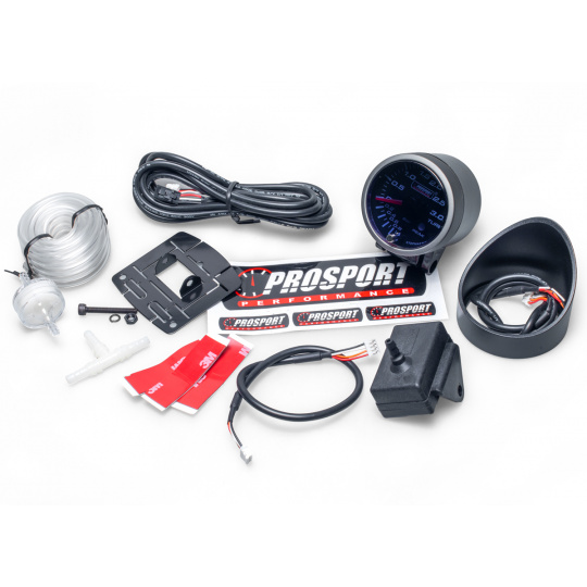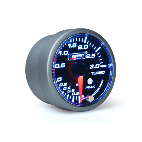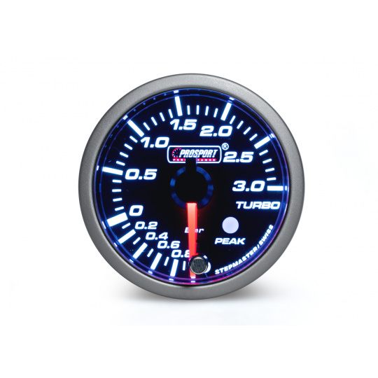 Přídavný ukazatel tlaku turba Prosport Performance - elektronický s rozsahem -1 až +3 bar ze série Premium vhodný pro upravené dieselové motory. Ukazatel je vybaven krokovým motorkem, který zaručuje maximální přesnost. Zároveň umožňuje nastavit špičkovou hodnotu, při jejímž dosažení se ukazatel zbarví do červena, rozsvítí varovnou diodu a ozve se zvukový signál. Podsvícení je možné přepínat mezi červeným a bílým a ideálně tak sladit vzhled budíku s interiérem vozu. Při otočení klíčku proběhne u každého budíku uvítací ceremoniál, při kterém je prověřen pohyb ručky v celém rozsahu (Scan), varovná LED dioda a funkčnost zvukového signálu. Poté se budík ustálí ve Vámi zvoleném barevném nastavení.