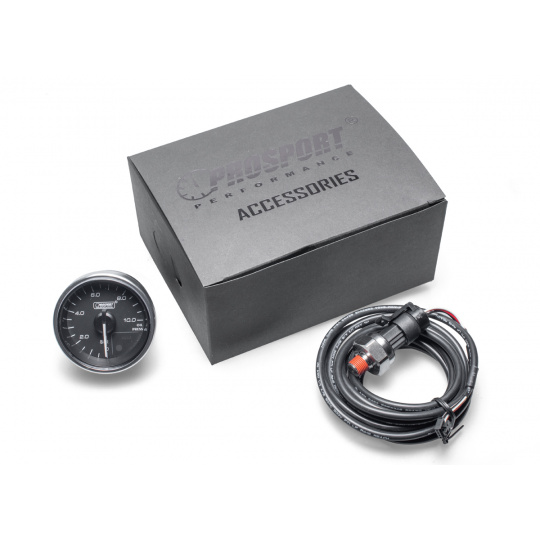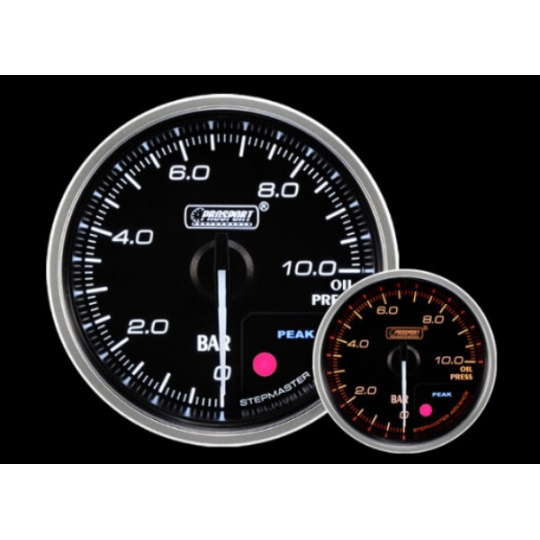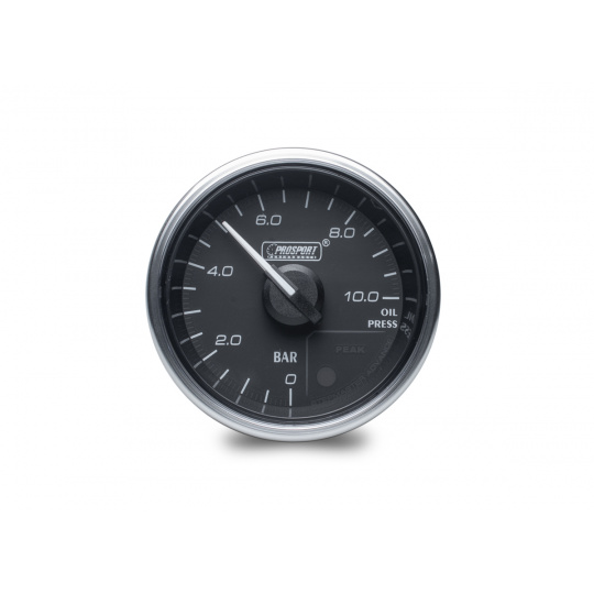 Přídavný ukazatel tlaku oleje Prosport Performance - elektronický s jemnou 270° stupnicí s měřeným rozsahem 0 až 10 bar ze série Supreme Series. Ukazatel je vybaven moderním krokovým motorkem Stepmaster Advance, který zaručuje maximální přesnost. Zároveň umožňuje nastavit Peak hodnotu, při jejímž dosažení se ukazatel zbarví do červena, rozsvítí varovnou diodu a ozve se zvukový signál.