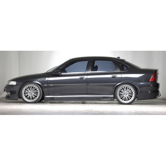Rieger boční práh mont. strana levá pro Opel Vectra B caravan, hatchback, notchback, plast ABS bez povrchové úpravy, s prolisem, s prolisem a dvěma výřezy