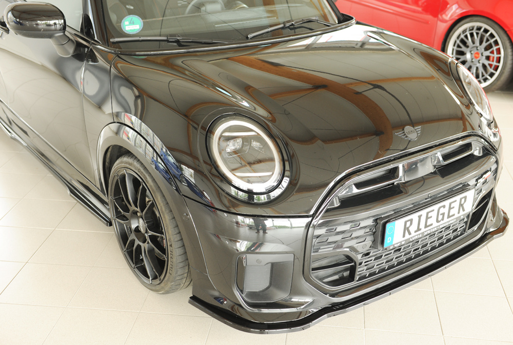 Exkluzivní lipa od německého výrobce Rieger Tuning navržená speciálně pro Mini John Cooper Works (typ F67, verze convertible) s rokem výroby od 02/25–. Vyrobena z odolného plastu ABS a dodávána lakovaná do černé lesklé barvy, která podtrhuje sportovní eleganci a dynamiku modelu JCW. Lipa nejen vizuálně rozšiřuje přední část vozu, ale zároveň zlepšuje jeho aerodynamiku.