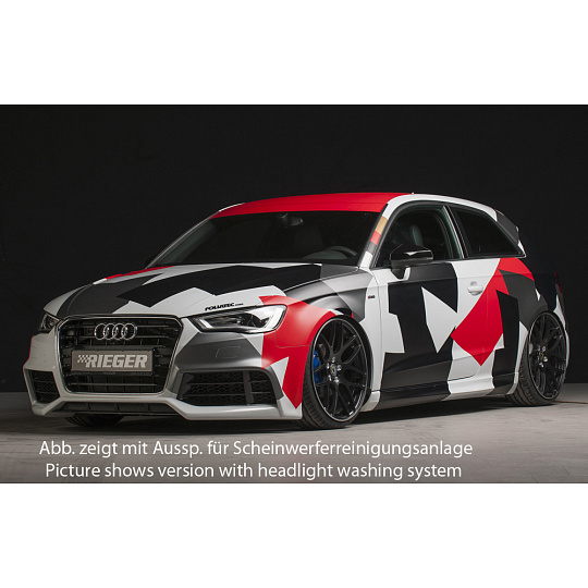Sportovní přední nárazník značky Rieger Tuning pro vozy Audi A3 (Typ 8V) ve verzích 3dveřový hatchback (8V1) a 5dveřový Sportback (8VA), určený pro modely před faceliftem (07/2012–08/2016). Vyroben z kvalitního plastu ABS bez povrchové úpravy, který je připraven k lakování do barvy vozu. Díky preciznímu zpracování zajišťuje perfektní přizpůsobení karoserii a zvýrazňuje dynamický vzhled vozu.