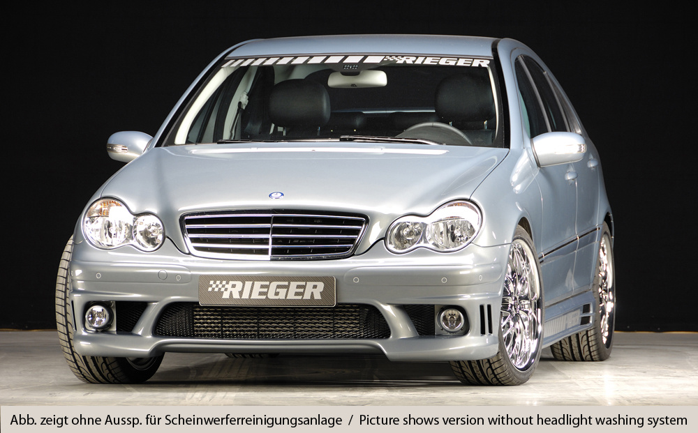 Přední nárazník značky Rieger Tuning je navržen pro vozy Mercedes-Benz třídy C druhé generace (typ W203), vyráběné od roku 05/2000, v karosářských verzích sedan a T-model (kombi). Tento sportovní nárazník zajišťuje perfektní lícování, moderní vzhled a je vyroben z odolného plastu ABS bez povrchové úpravy – připraveného pro lakování.