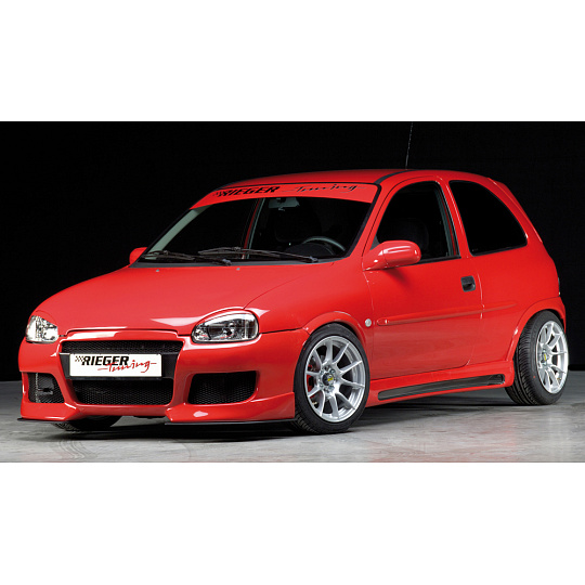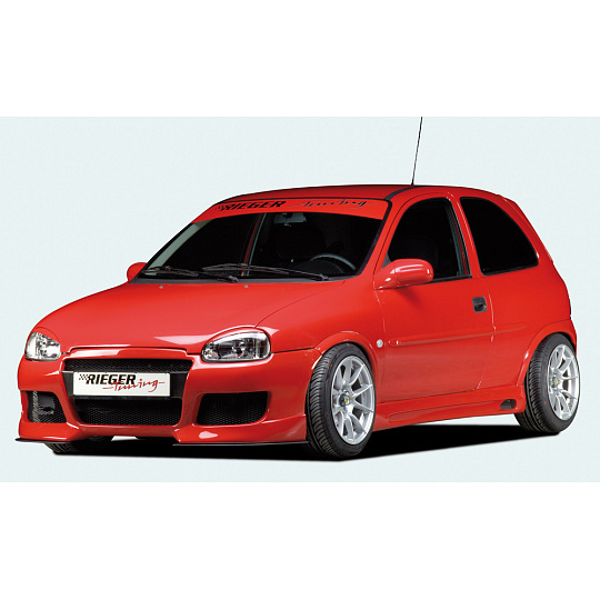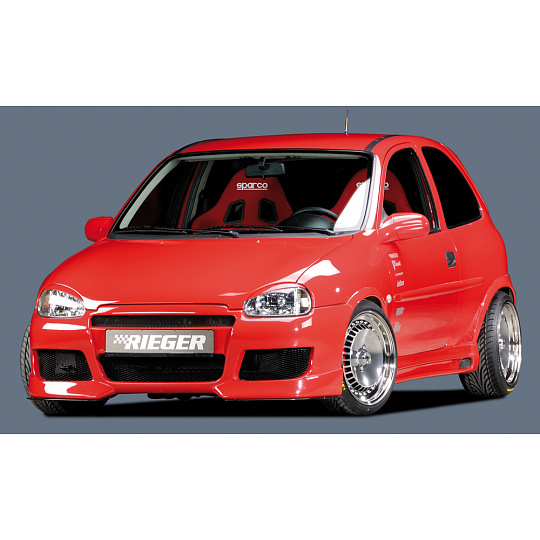 Přední nárazník od značky Rieger Tuning pro vozy Opel Corsa B včetně verzí po faceliftu. Určeno pro karosářské varianty 3-dveřová a 5-dveřová, vyráběné v letech 02/1993–09/1996 a od 11/1996. Vyroben z kvalitního plastu ABS bez povrchové úpravy – připraveno k lakování. Nárazník kombinuje sportovní vzhled a přesné lícování se sériovou karoserií.