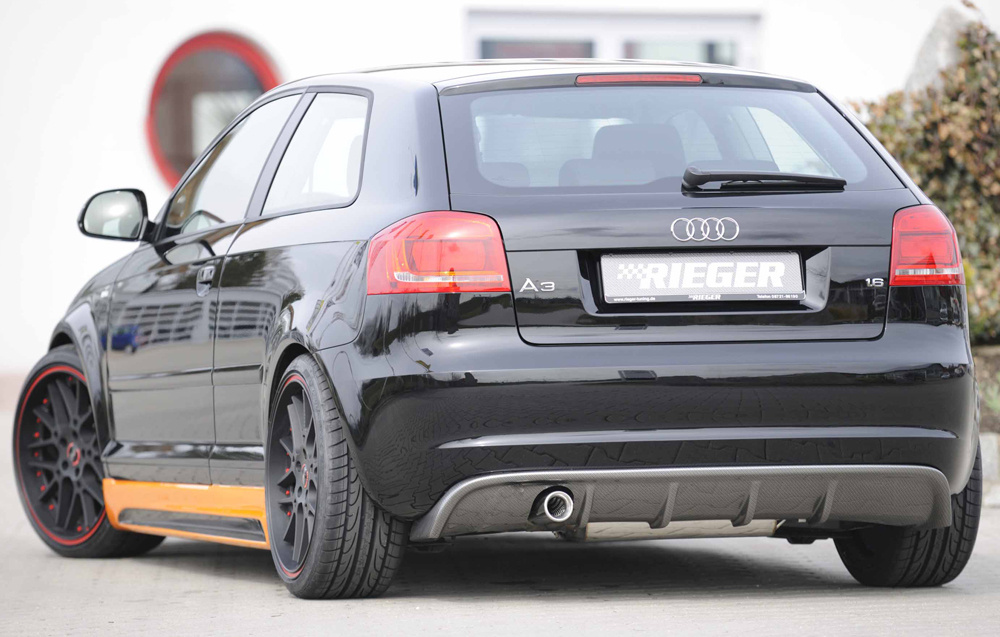 Vložka zadního nárazníku Rieger Tuning určená pro Audi A3 Typ 8P po faceliftu, karoserie 3-dv. a Kabriolet, roky od 07/08. Vyrobena z ABS plastu s povrchovou úpravou Carbon-Look. Balení obsahuje montážní materiál.