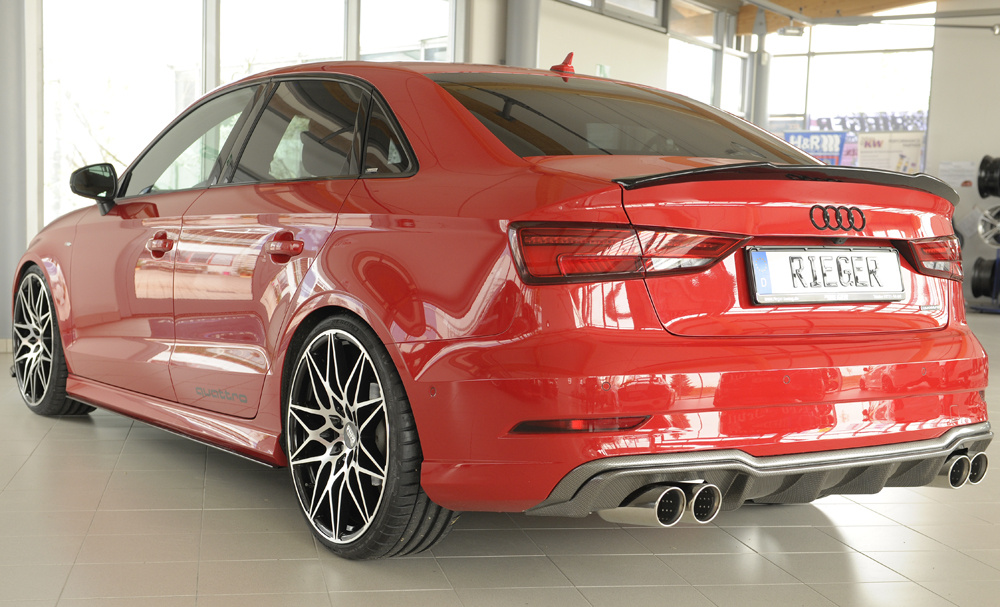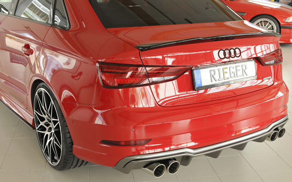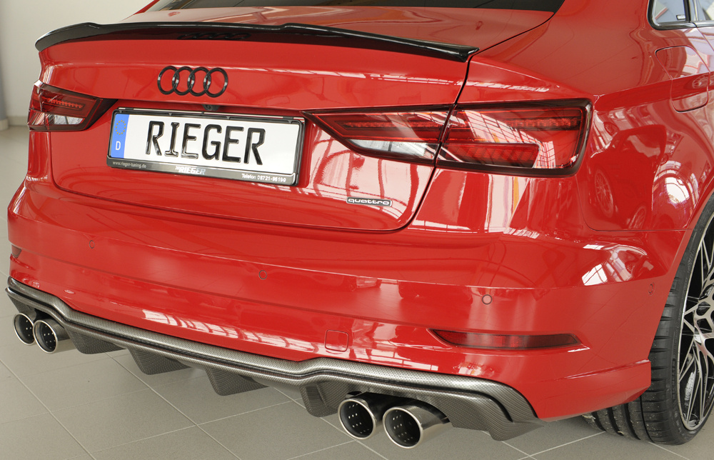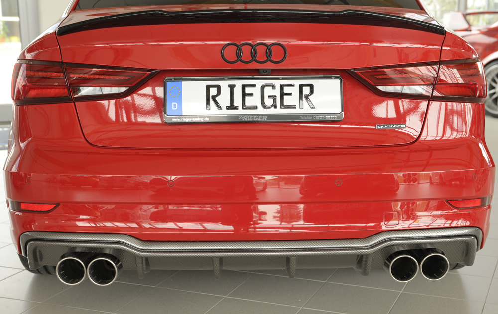 Rieger vložka zadního nárazníku pro Audi A3 8V 3-dvéř. (convertible 8V7), 5-dvéř. (sedan 8VS) po faceliftu, plast ABS s povrchovou úpravou Carbon-Look, pro sportovní koncovky na obou stranách 4x90 mm