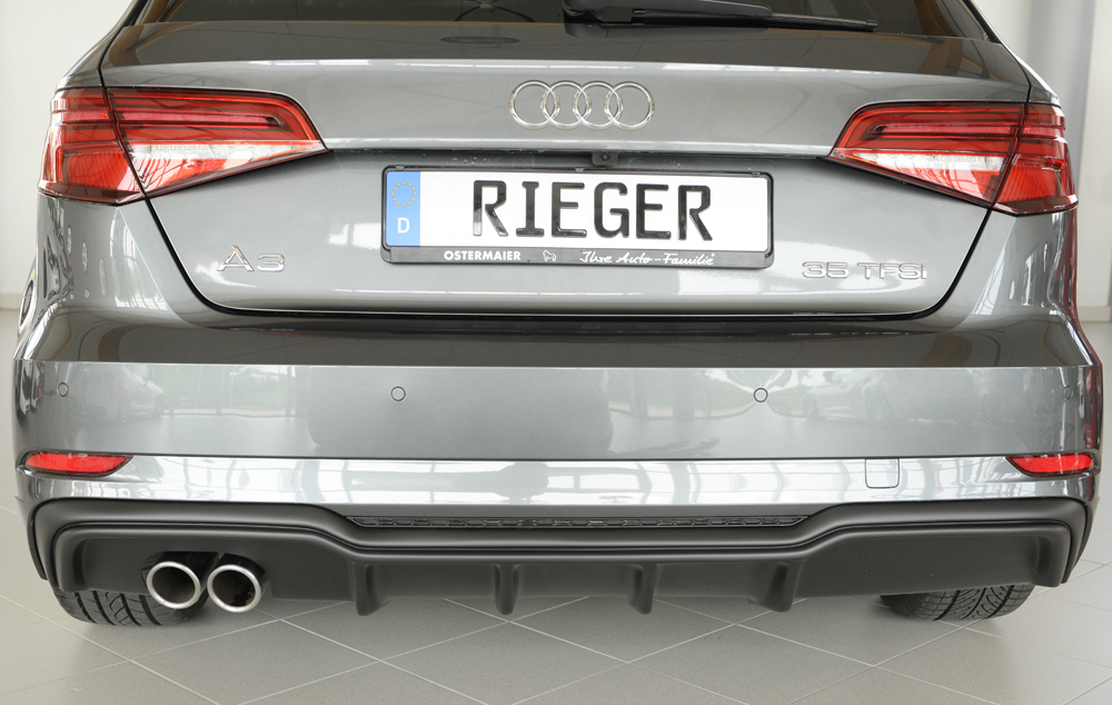 Vložka zadního nárazníku Rieger Tuning určená pro Audi A3 Typ 8V po faceliftu, karoserie 3-dv. hatchback (8V1) a 5-dv. Sportback (8VA), roky od 09/16. Vyrobena z ABS plastu bez povrchové úpravy. Balení obsahuje montážní materiál.
